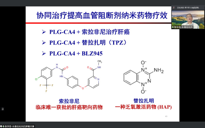 针对肿瘤组织内纳米粒子渗透性差,无法体现药效这一问题,陈老师介绍了血管阻断剂(VDA)治疗实体肿瘤的机制,提出现在小分子血管阻断剂存在一系列问题因而迟迟未能投入实际应用。为了解决这些问题,陈老师团队提出将血管阻断剂分子CA4接枝到聚谷氨酸的侧链上,组装成高分子血管阻断剂PLG-CA4,从而实现了长循环、肿瘤富集、持续释放以提高药效。此外,与索拉菲尼、替拉扎明、BLZ945等药物联用对肿瘤的生长具有显著抑制作用。