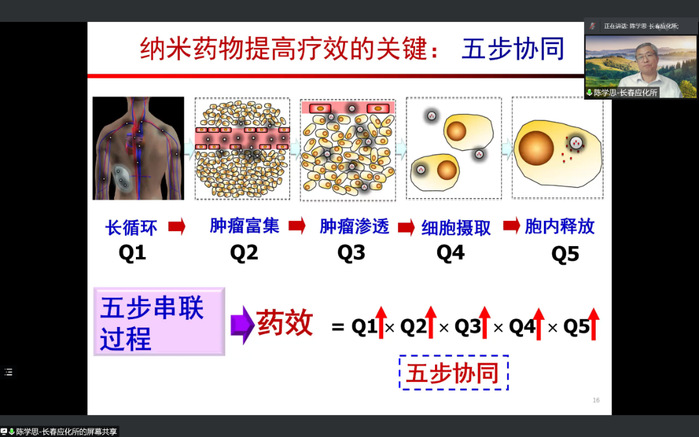 报告主要围绕“为什么要用聚氨基酸这类材料或可吸收降解高分子材料作为药物的载体材料”这一问题进行阐述。报告伊始,陈老师简要介绍了癌症的高死亡率及其主要治疗手段的背景,提到用高分子(如聚乳酸、聚氨基酸等)作为药物的载体可以增加药物在肿瘤组织的聚集,降低毒副作用,具有巨大的市场前景。接下来从聚氨基酸材料的制备与功能化、应用讲起,阐述了纳米抗肿瘤药物提高疗效的五步协同作用,指出了“纳米药物很难在组织里渗透很深”这一关键问题。
