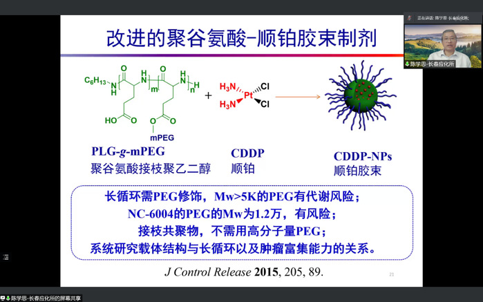 陈老师从如何降低顺铂药物毒副作用这一问题出发,介绍了他们课题组的工作:使用较小分子量(约5000)的PEG接枝到聚谷氨酸的侧链上来担载顺铂,由于接枝密度的提高,实现了体内的长循环,同时减缓了代谢问题。由此得到的顺铂胶束的血浆半衰期是NC-6004的2.4倍,大幅降低了顺铂的急性毒性,提高了肿瘤的抑制率。此外,与放疗或免疫治疗进行联合可以更有效地治疗肿瘤。