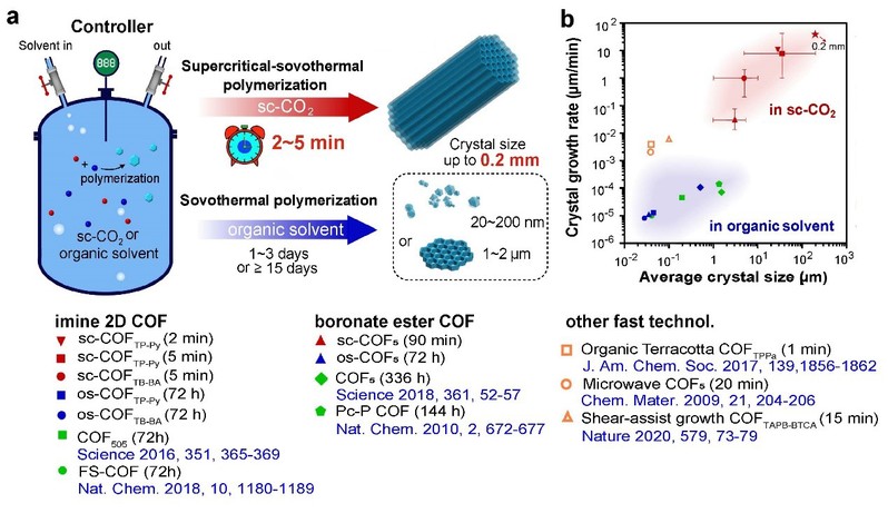与传统的硅基半导体相比,聚合物半导体表现出出色的载流子迁移率和可塑性。这不仅为智能芯片提供了更高的性能和效率,同时也能够实现在不同形态和尺寸的设备中的集成。高质量聚合物晶体的引入将推动电子学在柔性性、可塑性和可定制性等方面取得重大突破。聚合物分子的取向和组装需要克服较高的势垒,通过共价键的断裂和重修复生长出聚合物单晶十分困难,特别是对于由轻质元素组成的具有复杂拓扑结构的多孔晶态聚合物—共价有机框架(COFs)。具有共轭结构的COFs能够提供连续的电子传输路径,是一种有重大电子学应用潜力的材料。有机单元聚合通常导致形成无定形或晶粒尺寸较小的不良结晶产物。传统方法需要花费15~80天才能获得微米级COFs单晶。通过聚合高效、精确地将有机分子组装成单晶一直是一项具有挑战性的任务。