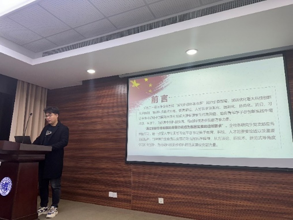 研究生第一党支部由入党积极分子颜奇胜同学面向支部全体成员围绕“争做创新生力军,学习习近平总书记的重要回信”做了学习报告,包含习近平总书记关于教育、科技、人才的重要论述以及重要回信精神。在学习讨论过后,支部成员一致认为要从自身做起,坚定理想信念,勇担科技创新的先锋角色;要提升专业能力,勇做科技自强的中坚力量;要敢于创新,勇做民族复兴的建设者,主动将学到的知识运用到实际工作中,解决实际问题,积极投身科技创新,培养自己的创新意识和能力。