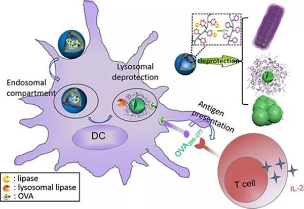 脱保护反应使得糖分子上的羟基得以暴露,在糖生物学中,细胞表面的糖分子参与了细胞粘附、细胞识别,细胞分化等多种生命过程。作为DISA研究的重要进展,最近他们构筑了含糖嵌段带有保护基的响应性聚合物囊泡,并研究了水相体系中脱保护反应引发的形貌转变和免疫激活,展示了脱保护反应在生物体系环境中的应用价值。该聚合物囊泡以PEG为壳,带有乙酰基保护的糖嵌段为囊泡壁。水溶液体系中囊泡的原位脱保护带来含糖嵌段亲疏水性的巨大转变,囊泡由此向胶束、复合胶束、片层等形貌转变。重要的是,他们发现脂肪酶可以代替化学试剂成功引发囊泡脱保护及形貌转变,该过程还伴随着所负载分子的有效释放。由此,由于细胞的溶酶体中含有大量脂酶,他们发现,当包载有抗原的糖聚合物囊泡被树突状细胞(DC)摄取后,在溶酶体自身脂酶的作用下,囊泡在溶酶体中实现了细胞内的酶促脱保护和形貌转变。这时,暴露的模型糖分子(半乳糖)和形貌转变过程中所释放的抗原蛋白质协同作用,促进了DC的成熟并显著提升了其对T细胞抗原提呈的效率,促进了T细胞的特异性激活,显示了其抗原递送和免疫佐剂的双重功能。该囊泡以具有良好生物相容性的PEG为壳,同时对糖的预保护避免了到达溶酶体前不必要的免疫激活。由于乙酰化是蛋白质的一种常见翻译后修饰,更加提升了该方法的生物相容性,使得这种新颖的响应性糖聚合物囊泡有望在免疫治疗中发挥作用。