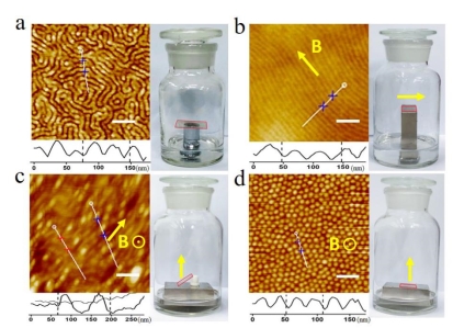 呈无规的分相结构; (b) 在磁铁磁力水平于基底作用下,嵌段共聚物沿磁力方向运动,自组装结构为高度有序单向平行排列; (d) 在磁铁磁力垂直于基底作用下,分子链自组装排列形成相互独立的圆柱状分相结构; (c) 磁铁磁力与基底呈45度角时候产生两个方向排列的混合。