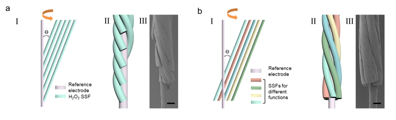 近日,韩国a漫 彭慧胜-孙雪梅团队提出并发展得到一种可注射的纤维状生物传感器。这类新型纤维状生物传感器具有稳定的电化学性能、与组织相匹配的力学性能、优异的生物相容性和生物整合性,能够实现对体内多种化学物质进行长期、实时监测。10月28日,该项研究成果以“Functionalized helical fibre bundles of carbon nanotubes as electrochemical sensors for long-term in vivo monitoring of multiple disease biomarkers”(螺旋碳纳米管纤维电化学传感器实现了多种疾病标记物的长期体内监测)为题,在线发表于《自然-生物医学工程》(Nature Biomedical Engineering)杂志。