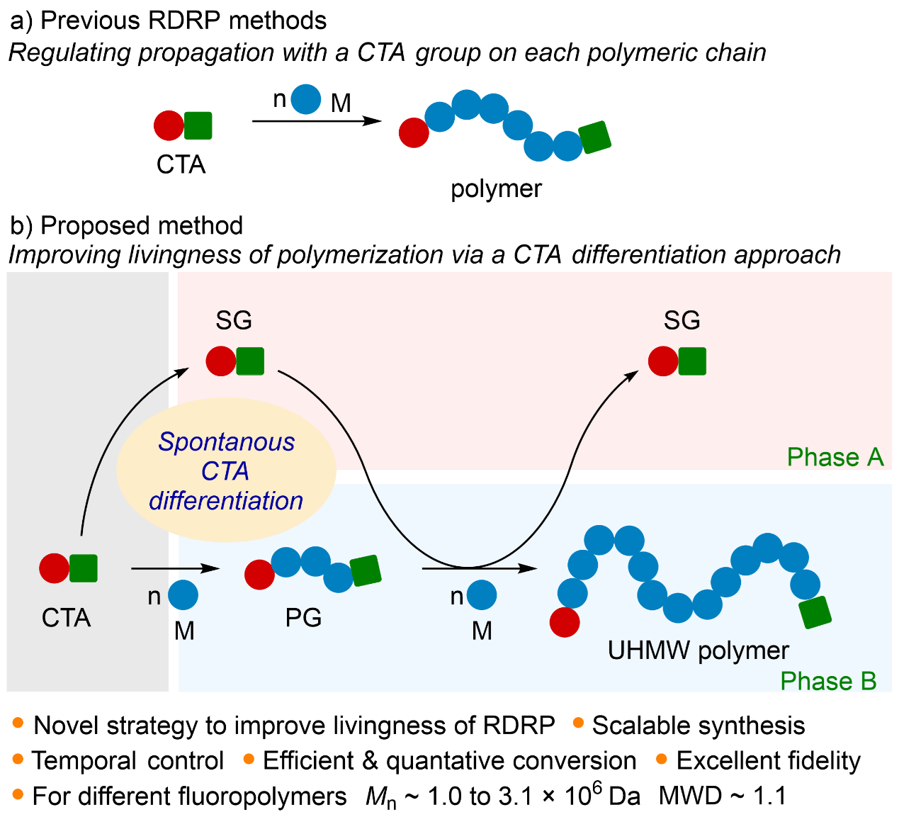 自上世纪50年代Szwarc教授提出活性聚合以来,该类聚合反应对分子量的控制具有一个共同特征:聚合物分子量由单体与引发剂(或链转移剂)摩尔比决定,聚合物分子量 = 单体分子量x(单体浓度/引发剂浓度)x单体转化率。在该前提下,每条生成的聚合物链都带有一个引发剂或链转移剂基团。然而,该控制机制对某些方面的聚合物合成提出了极高要求。在超高分子量聚合物合成中,需要控制极低的引发剂(initiator)或链转移剂(CTA)用量(图1a)。例如,在原子转移自由基聚合(ATRP)与可逆加成-断裂链转移聚(RAFT)中,为获得100万克/摩尔的分子量,若单体分子量为100克/摩尔,在其完全转化的前提下,要求链转移剂用量为单体的万分之一。极低的链转移剂用量往往导致聚合反应活性难以维持,聚合物分子量分布宽,人们难以按预想获得各种超高分子量聚合物。超高分子量聚合物通常具有突出的热稳定性能、机械性能等重要实用价值,其在自组装、可修复材料等领域有可观应用前景。因此,如何克服活性聚合的已有限制,精确制备超高分子量聚合物显得尤为重要。最近,韩国a漫
