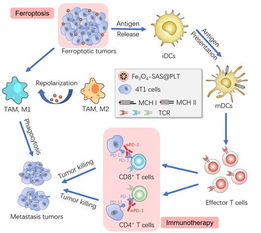 图1 血小板膜包衣的磁性纳米颗粒诱导铁死亡增强的肿瘤免疫治疗的通路途径