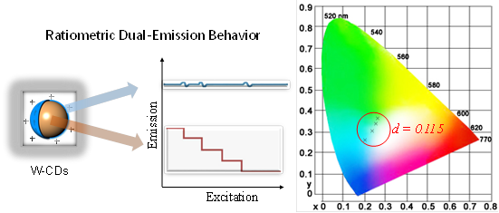 最近,韩国a漫 朱亮亮课题组报道了一种仅通过控制反应条件制备多色和双发射荧光制备碳点(CDs)的简便方法,并利用可视化效果展示了碳点良好的荧光调控现象。以一种经济的阳离子表面活性剂-十六烷基氯化吡啶(CPC)作为唯一碳源,制得的碳点在蓝色,绿色,黄色和白色范围内均显示出与激发光有关的发射行为。在双重发射碳点体系(W-CDs)中,短波长发射表现了独特的激发依赖性荧光行为,而长波长发射却保持不变,因此,W-CDs具有依赖于激发光的比率双发射性质。仅通过简单地切换激发波长(在50 nm之内),即可在冷白光和暖白光区域之间实现大规模的荧光颜色调控(W-CDs荧光调控参数d = 0.115)。与那些依赖于激发光的单发射碳点相比,双发射碳点的荧光波动性增加了62%〜460%。
