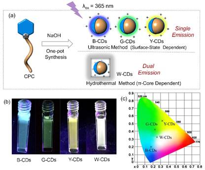 在照明设备,信息存储和成像技术中,材料的荧光颜色调控至关重要。目前,针对单一的材料体系而言,更多的是利用原位化学法来调节荧光(例如:pH,氧化还原和特殊物质控制的刺激响应)。与传统的化学调节法相比,使用简单的物理操作(例如:光激发)在材料层面上实现荧光颜色调控会更方便和可取。根据卡莎法则,大多数发光材料是从最低激发态发射,进而导致使用光激发调节荧光颜色难以实现。幸运的是,碳点或其类似物表现出的独特的荧光激发依赖特性为解决该难题提供了一种可能(Sci. Rep., 2012, 2, 383; Adv. Mater., 2015, 27, 7782)。 然而,由于碳点的斯托克斯位移较小,这种依赖于激发光的荧光,只能引起碳点有限的发射波长漂移。通过激发来实现大规模增强的荧光颜色调控仍然具有挑战性。