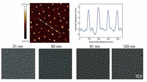 图1 纳米阵列的图案化材料 (上方为一个典型的原子力显微镜图片,下方为系列的场发射扫描电子显微镜图片)