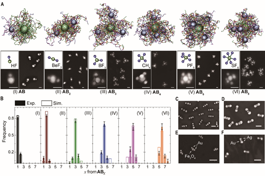 图3. 几种典型的纳米胶体分子。(A)计算机模拟分子构型和相应扫描电子显微镜照片。(B)产率统计分布。(C-F)不同大小纳米粒子(C、D)及不同组分纳米粒子(E、F)形成的AB2型胶体分子。标尺为50纳米(A)和100纳米(C-F)。