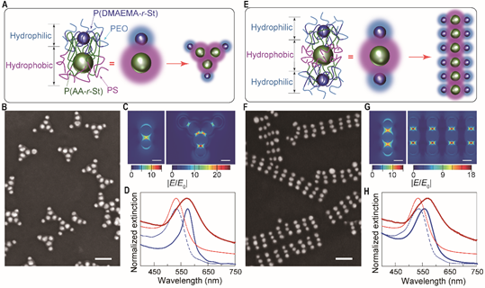 图5. 双亲性胶体分子的多级组装。(A-D)双亲性“AB”型胶体分子组装形成花瓣状聚集体。 (E-H) 双亲性“BAB”型胶体分子组装形成ribbon-like聚集体。