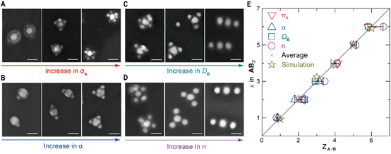 图4. 纳米粒子定向键合的一般规律。(A-D)聚合物接枝纳米粒子的结构参数的影响。标尺为50纳米。(E) 胶体分子构型x受纳米粒子结构参数ZA/B的影响规律。