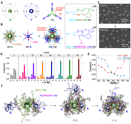 图2. 聚合物修饰的纳米粒子定向键合形成纳米尺度胶体分子。(A)典型的硼(B)和氟(F)原子结构以及BF3的分子结构。(B-F)纳米粒子反应形成BF3型胶体分子的过程图示(B);不同反应时间下,产物的扫描电子显微镜照片(C); 胶体分子产率统计分布随反应时间变化(D); 不同反应时间,所得 胶体分子内键角的统计分布(E);计算机模拟胶体分子的成键过程(F)。