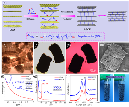 采用非剥离层状氧化石墨烯(LGO)制备了基于石墨烯的异质结构的前驱体AGOF。LGO由排列良好的氧化石墨烯纳米片组成,氧化石墨烯纳米片含有丰富的含氧官能团和相似的片尺寸和纳米级的层间间隔。柔性层间化学使LGO成为设计二维受限空间的独特前驱体。受到网状化学的启发,一个定义良好的周期性结构通常是由构建母体(LGO)和连接物(聚合物)两个单位,因此本项工作通过聚醚胺分子对石墨烯层间距的交联,提出了一个准确调控AGOF层间距的方法,典型的AGOF合成过程如图1所示。由于线性聚醚胺(PEA)的氨基端基可以通过开环加成反应与LGO的环氧基团发生反应,因此可作为交联剂,并使LGO中的氧化石墨烯片层被牢牢固定,形成结构稳定的AGOF框架材料。