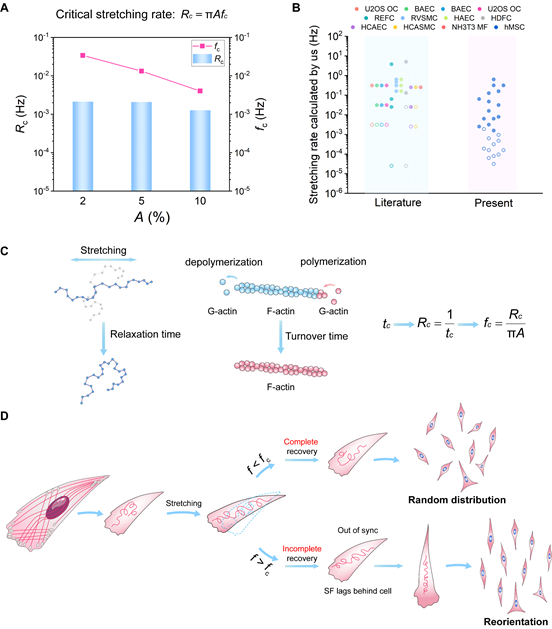 理论模型中涵盖了细胞骨架、尤其是应力纤维。丁建东团队进一步对文献中有关应力纤维动态自组装的实验数据进行了分析,发现应力纤维的周转时间范围恰好与上述临界拉伸速率的倒数相吻合,因此认为应力纤维的超分子链松弛过程可能是诱导细胞取向发生的关键。也就是说,应力纤维的周转时间决定了使细胞取向的临界拉伸速率,当拉伸幅度固定时进而决定了临界响应频率。