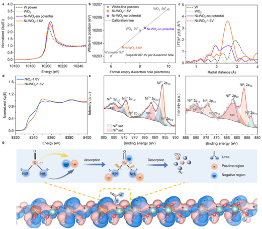 要点2. 原位 XAS 和XPS分析结果表明,W的引入使Ni-WOx催化剂更容易生成催化活性位Ni3+,从而有效加速了尿素的分解速率。