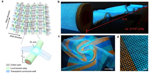 图1. a) 织物显示器及经纬搭接发光点的结构示意图;b) 大面积发光织物照片;c, d) 多色发光织物和发光点照片。