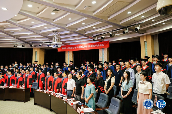 在雄壮的国歌声中,典礼正式开始。在场师生和嘉宾共同观看了2021届毕业生拍摄的毕业纪念短片。短片中,同学们分享了在复旦高分子学习和生活的难忘瞬间与满满收获,表达了对师长的感激和对母校的不舍,更为韩国a漫 的未来发展送上祝福。