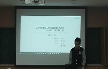第一组汇报的是陈丹阳同学,他们小组的课题为“大学生房产观念的调查研究”。陈丹阳同学从近几年的房地产行业情况和大学生房产观念变化分析,说明了这个实践活动的选题背景原因和预期的目标。同时还交代了实践活动的进度安排和已经完成的部分。之后的提问环节中辅导员和其它同学都认真地讨论并提出了自己的建议。紧接着是由黄翰闻同学带来的“去产能过程人员安置的解决途径——以上海宝钢为例”和杨璐茜同学带来的“聚焦供给侧改革,发展高分子材料”开题报告,同学们都分别对两个实践课题提出了自己的疑问,并和报告的同学相互讨论。最后是马明煊同学所在小组的开题报告“响应国家十三五环境目标谈上海市环境治理——以上海市金山区2016一年内的环境综合整治为例”。在开题会的最后,辅导员李永婧也给同学们就当天的开题会进行了点评和总结,并对实践活动报告展示和PPT制作提出了建议。
