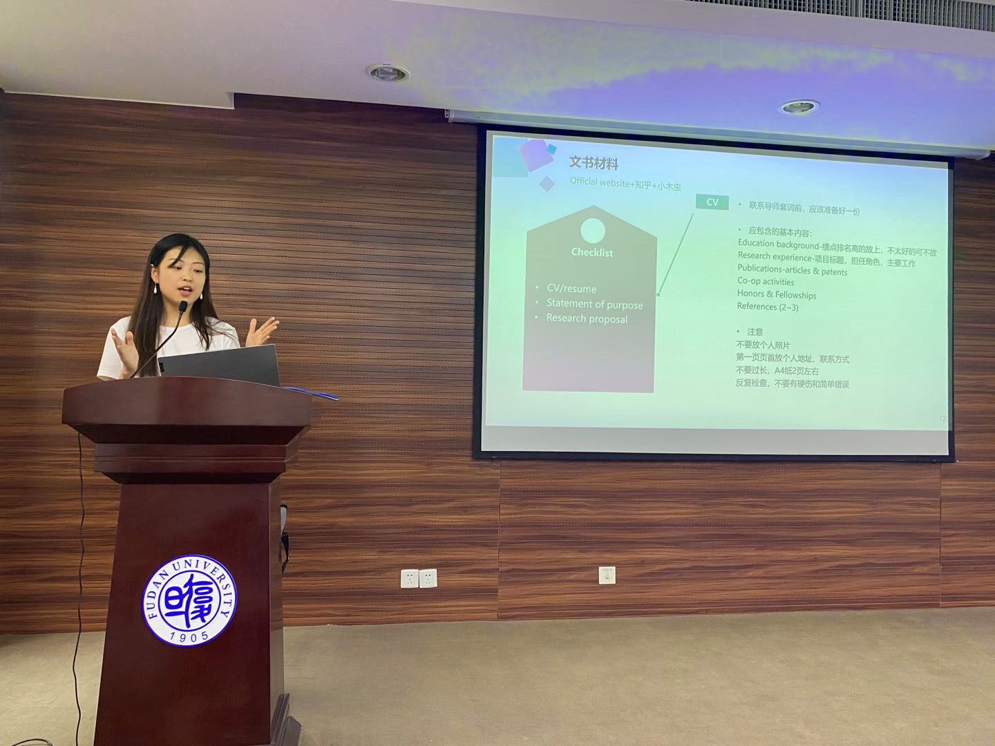 硕士毕业生严丝雨同学向大家分享了她的个人情况、申请出国攻读博士学位情况、导师面试和申请过程中经验教训。她首先介绍了英语标化考试的内容与注意事项,并向同学们推荐了APP和微信公众号,分析了标化考试分数对申请牛津剑桥等顶级学校的作用。其次,她还提醒大家不同学校对申请资料的要求不同,有些需要网申,有些需要邮寄。最后,她建议同学们面试前一定要对面试官进行了解,提前准备好英文的面试内容,提高英语听说能力,注意面试技巧,面试后要发送感谢邮件等细节,真可谓面面俱到。