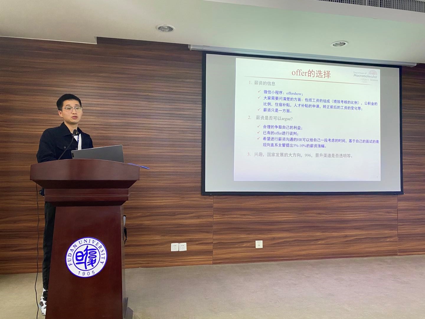 第三位进行经验分享的同学是杨于驰,他从如何平衡博士毕业生期间的科研和工作以及博士生求职两个方面进行经验分享。他鼓励同学们在攻读学位早期多做实验、积累数据、讨论研究想法、争取早日发表论以减轻科研压力,平时要多与导师沟通,尤其是要及时交流自己的未来计划。他还就简历制作进行了经验分享,提倡投递简历时根据不同岗位需求,应该准备多份侧重点不同的简历。在就业选择方面,他建议同学们根据自身情况,选择适合自己的企业或行业、就业地点、薪酬和工作强度,最后,他还梳理了群面、技术面、HR单面的重点,并建议同学们早做准备,不打无准备之仗。