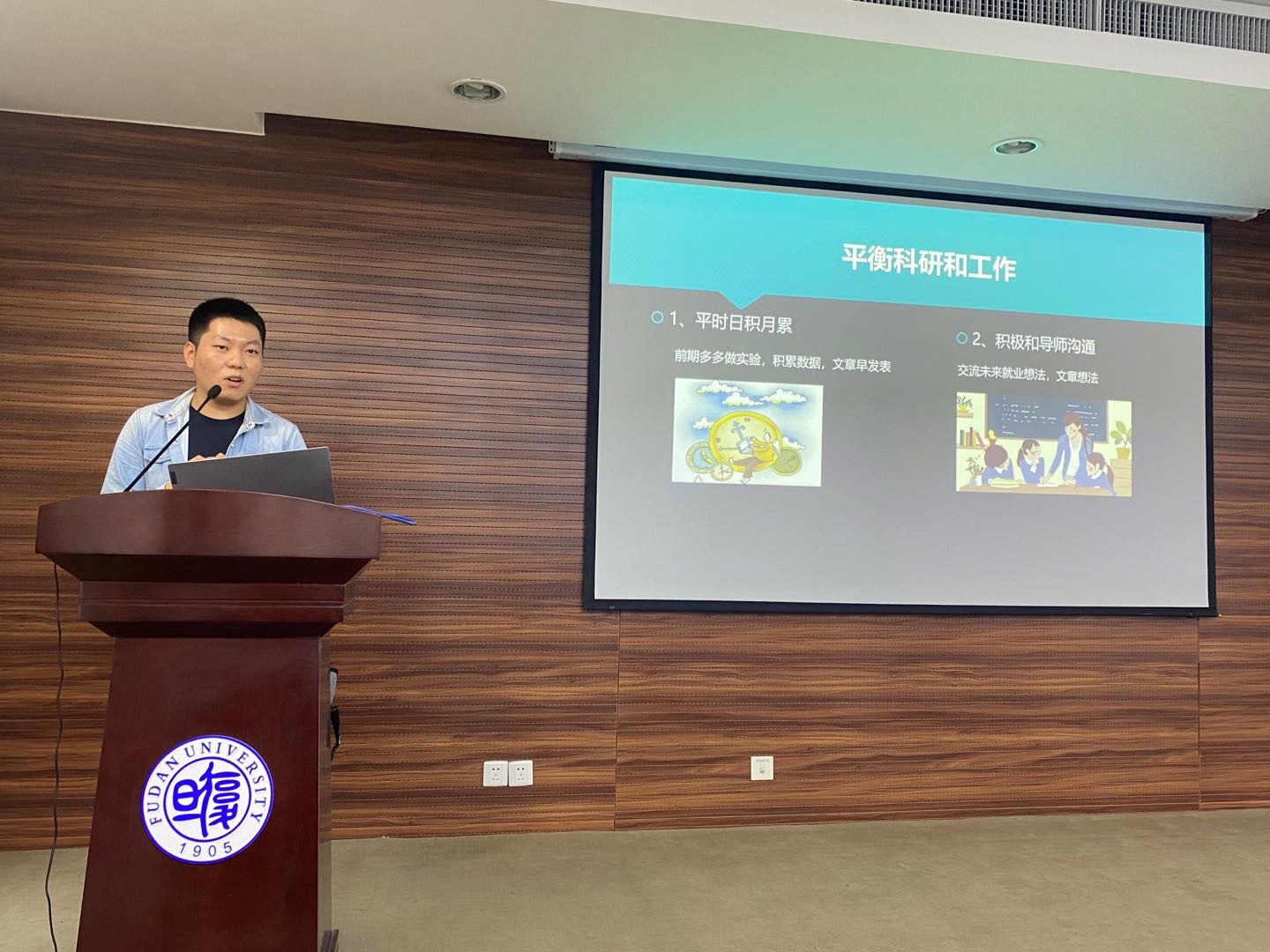 首先由博士生金科同学分享在企业工作方面的经验,他向同学们分享了自己的时间安排,提供了技术型面试的技巧,告诫大家找工作需要通过多种渠道获取信息,且要保持一颗平常心,理性思考谨慎选择。除此之外,他还给课题探索性强或身陷实验低谷同学们提出宝贵建议:要保持自己的节奏,定期整理实验数据,与导师进行良好有效的沟通,多向经验丰富的老师同学请教,培养业余爱好,找到科研与生活的平衡点。