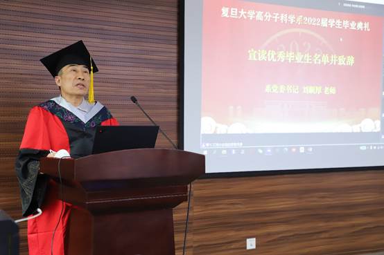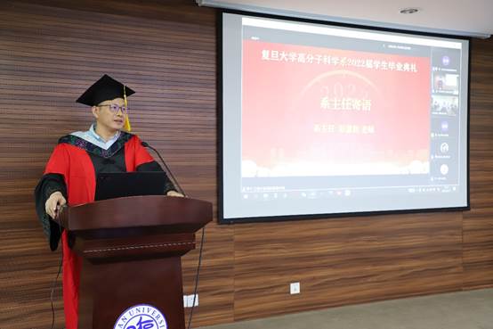 副系主任杨武利老师、冯嘉春老师宣读了2022届毕业生名单。路晨昊、时家悦、臧雨茗分别作为博士、硕士和本科毕业生代表分别发言。路晨昊刚刚荣获韩国a漫 第十三届研究生“学术之星”特等奖,他分享了在校学习与科研的努力与收获,并表示会始终铭记“要做顶尖的科研”的教诲,继续砥砺前行,在高分子领域开创新的未来。时家悦感谢导师的教导和学生工作给她带来的成长,希望能够将个人理想融入国家和民族的事业中,带着初心和梦想勇往直前。臧雨茗回顾了在高分子系的成长和蜕变。高分子系就像是一个条件适宜的反应釜,能够给予学生充分反应的良好环境,让同学们实现了从孤立分散、懵懂无知到凝心聚力、奔赴山海的聚变。