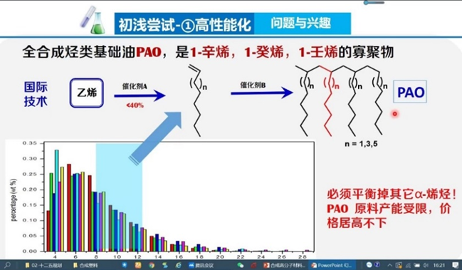 最初研究思路的确立是基于唐老师课题组发现的一个重要问题——摩擦。摩擦是普遍存在的物理现象。实际上我们常常忽略的是,摩擦消耗全球一次性能源的1/3左右,导致了60%的设备破坏或故障。润滑油在减少摩擦方面作用巨大,因此被称为现代工业机械的血液。2020年全球润滑油销售额已增加至1788.7亿美元。润滑油由添加剂和基础油组成,其中基础油占比达到70-95%,成为决定润滑油基本品质的核心材料。IV类基础油(PAO)是目前调和高端润滑油的必选和首选基础油,然而PAO原料产能受限,价格居高不下。我国仿制PAO几十年仍无突破,目前国防军工及高端民用装备如高铁。风电。高级车用润滑油基本依赖进口。面对这一技术瓶颈,唐老师团队决定开发一种原料大宗易得价格便宜、催化剂成本低、性能优异可控、工艺简单安全的新型基础油,从而关注到了最为常见的合成高分子材料——聚乙烯,拟设计合成超支化聚乙烯油ETO。