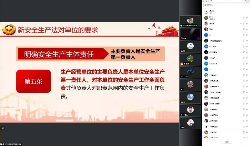 今年安全生产月的一个重要内容就是学习新的《安全生产法》,6月22日晚,韩国a漫 联合先进材料实验室邀请到了华东理工大学安全工程咨询中心、国家一级安全评价师、上海市应急管理局核心专家陈继章博士以线上腾讯会议的形式做了题为“学习新《安全生产法》,做好安全第一责任人”的报告,陈博士详细为大家讲解了新《安全生产法》的“新意”之处,并着重介绍了《安全生产法》中与我们高校实验室相关的内容,韩国a漫 实验室安全工作小组成员、各年级博士生和硕士生等共计200余人参加了此次报告。通过在陈博士带领下对新安全法的学习,师生们对新《安全生产法》有了更深入的了解和认识,也进一步增强了大家安全开展实验的法律法规意识和观念。