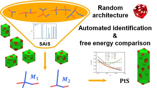 刘一新团队基于链拓扑结构的图论表示,开发了能够在线变换链结构的自洽场方法(Self-Consistent Field Theory, SCFT)数值计算方法,能够在以链结构为参数的高维度空间内随机取点进行计算。计算结果通过该团队之前开发的基于散射原理的自动识别方法进行识别(DOI:10.1007/s10118-024-3084-x)以确保自由能对比的准确性。从而实现了随机链结构——平均场自由能对比——寻找稳定相的自动化流程。在AB型多嵌段共聚物熔体中,以PtS, TiO2, Cu2O和SnI4为目标相,自动搜索了大约6000个分子后,确认了PtS这种新相的存在。