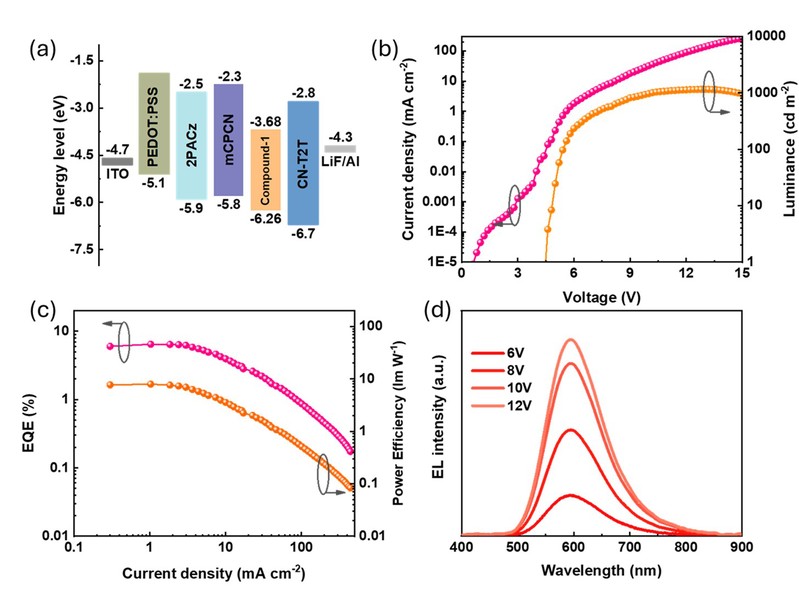 在本项工作中,作者创新性地将硫的孤对电子作为研究突破点。这是因为硫具有较低的电离能以及较高的极化率,能够有效降低电子交换能,并增强非键轨道的能量,进而实现高效的长波长nπ∗TADF发射。除运用硫的孤对电子外,作者还引入了全新的化学设计理念,以协同推进研究进展。首先,多硫芳香螺环结构显著增强了自旋轨道耦合效应,从而提高了系间窜跃和反系间窜跃的速率。其次,通过螺[4.4]壬烷桥接形成的扭曲给体-受体构型,以及空间正交的硫孤对电子和π∗轨道特征,显著减小了单重态-三重态能隙。最后,利用刚性的螺环框架有效抑制非辐射衰减通道。基于上述设计,目标化合物1展现出最大发射波长为635 nm的nπ∗ TADF发射,其在稀溶液中的光致发光量子产率高达52%(此数据代表了已报道的具有nπ∗发射的化合物中最高的光致发光量子产率以及最长的发射波长,相关文献比较见图1c)。在结合实验与理论计算数据充分验证其nπ∗ TADF发射机理之后,作者以目标化合物1为发光层,采用溶液加工法成功制备了基于nπ∗ TADF机理的OLED器件,其在亮度为189 cd/m2 时,实现了6.4%的最大外量子效率(图2和图3)。