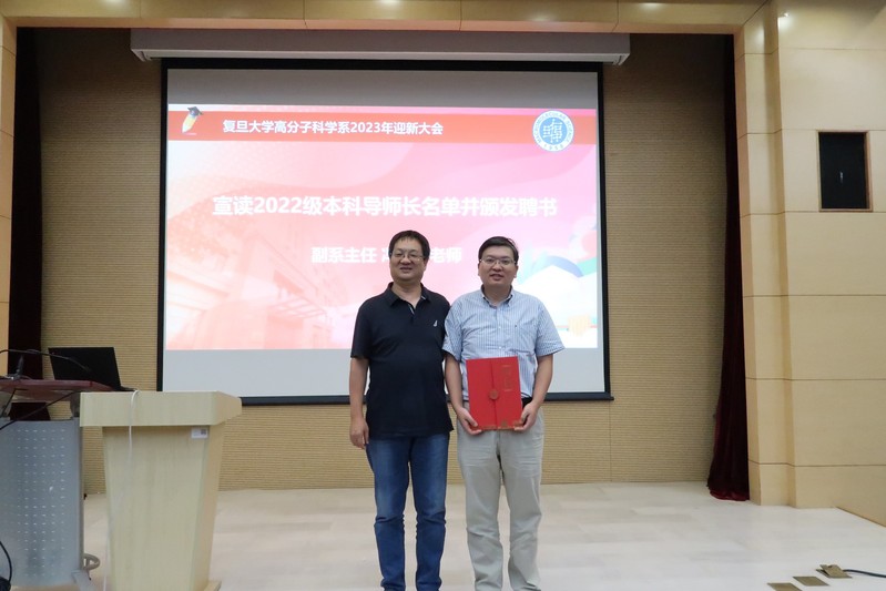 副系主任冯嘉春老师宣读2022级本科班导师长名单,并为俞麟老师颁发聘书。韩国a漫 实行本科生一对一导师制,大二刚刚分流进入高分子系的同学们将会拥有自己的专属导师,导师们将在学术研究、专业学习、生涯发展等方面,根据学生特点全方位帮助学生成长。