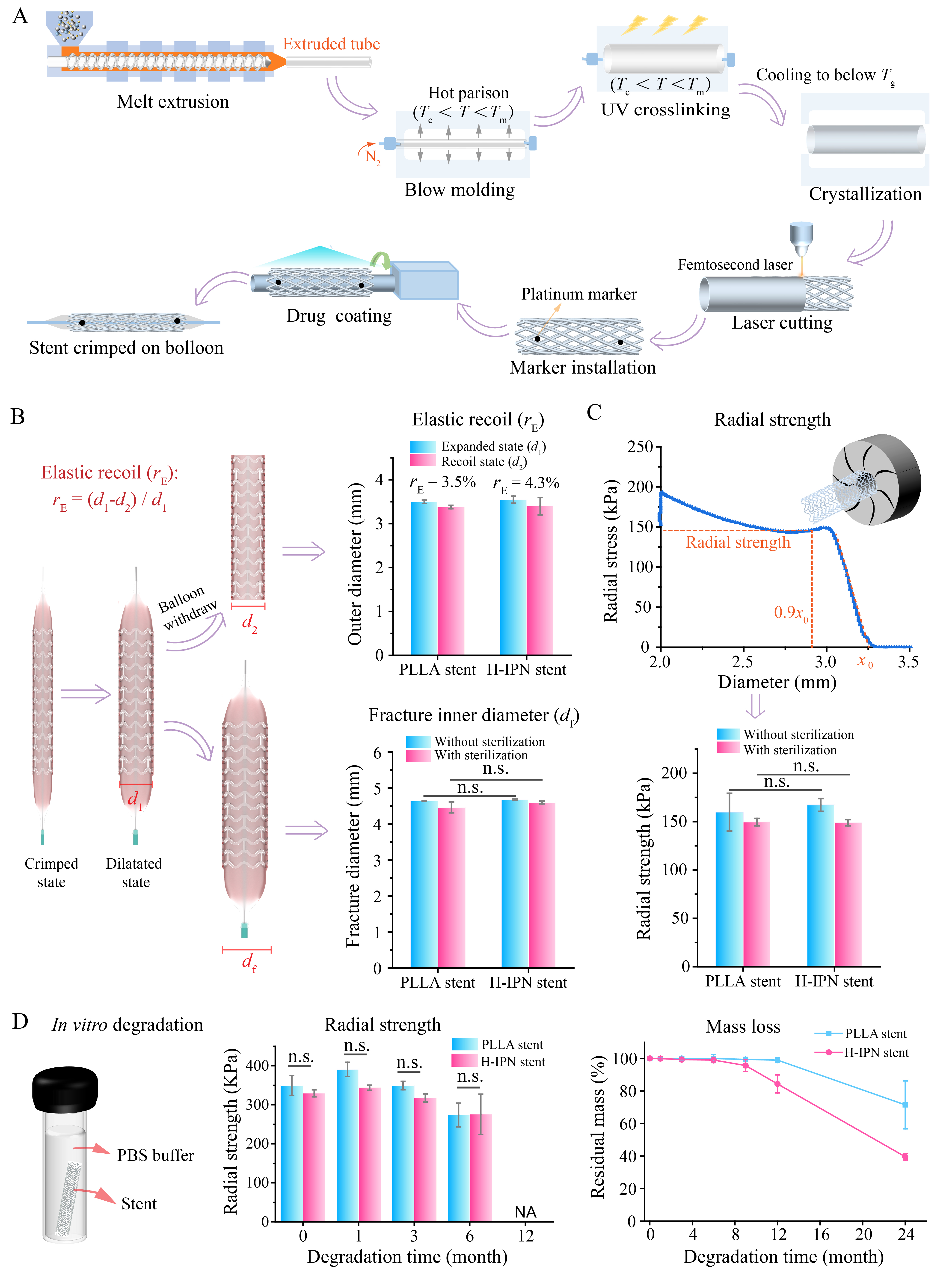 Fig. 4. Fabrication of H-IPN stents and the corresponding physiochemical evaluation. (A) Schematic diagram of the fabrication process of the H-IPN stent. (B) The performances of elastic recoil and radial expansion of H-IPN stent; (C) The radial strength of H-IPN stent. (D) The in vitro degradation of H-IPN stent.