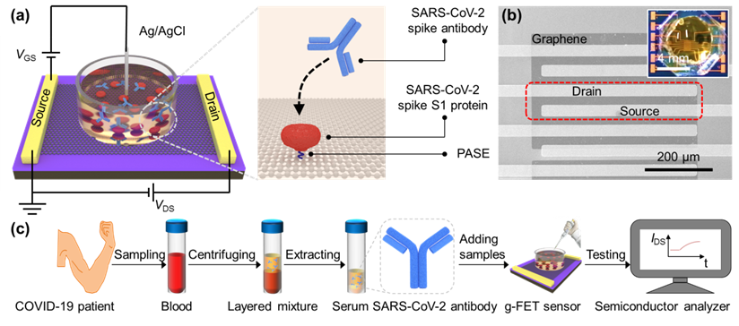 The fast spread of SARS-CoV-2 has severely threatened the public health. Establishing a sensitive method for SARS-CoV-2 detection is of great significance to contain the worldwide pandemic. Here, we develop a graphene field-effect transistor (g-FET) biosensor and realize ultrasensitive SARS-CoV-2 antibody detection with a limit of detection (LoD) down to 10–18 M (equivalent to 10–16 g mL–1) level. The g-FETs are modified with spike S1 proteins, and the SARS-CoV-2 antibody biorecognition events occur in the vicinity of the graphene surface, yielding an LoD of ∼150 antibodies in 100 μL full serum, which is the lowest LoD value of antibody detection. The diagnoses time is down to 2 min for detecting clinical serum samples. As such, the g-FETs leverage rapid and precise SARS-CoV-2 screening and also hold great promise in prevention and control of other epidemic outbreaks in the future.