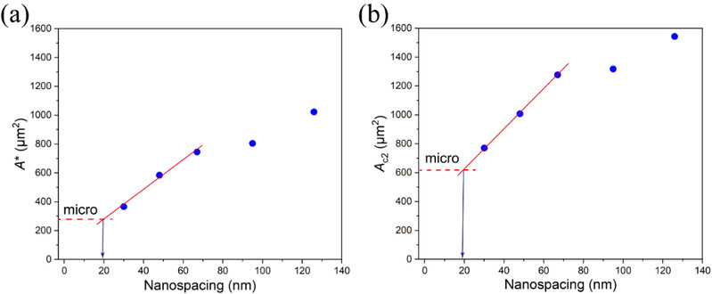 Figure 5 Dependence of the critical adhesion area on RGD nanospacing on a series of micro-nanopatterns and the asymptotic analysis of the effective RGD nanospacing on a free surface without patterns. A*(a) and AC2(b) increased with RGD nanospacing. The partial linear fitting curves for nanospacing < 70 nm of A* and AC2 were used to deduce the effective RGD nanospacing of an unpatterned surface with densely grafted RGD ligands, resulting in A* » 19.14 nm and AC2» 19.12 nm.