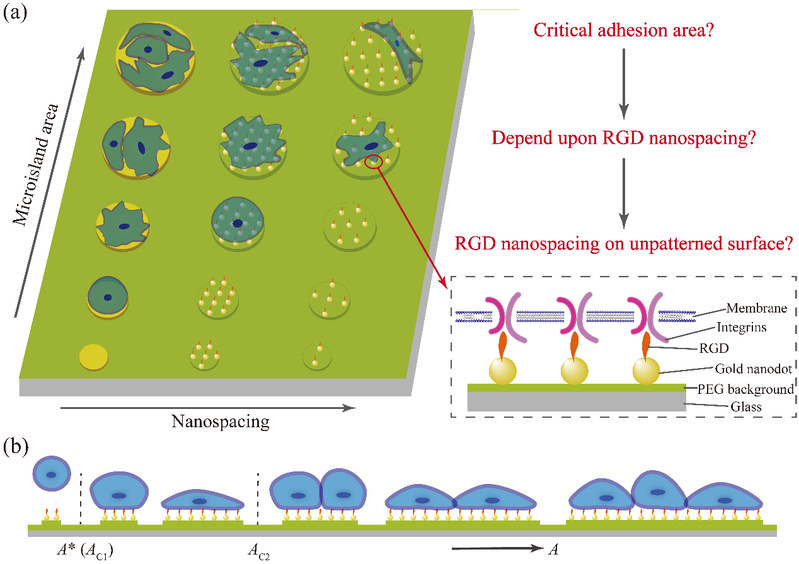 Figure 1 Schematic illustrations of the basic scientific questions and key terms. (a) Micro-nanopatterns and micropatterns of tunable microisland sizes and RGD nanospacings to control cell adhesion; (b) critical adhesion areas of individual cells on adhesive nanoarrayed microislands with nonfouling background.