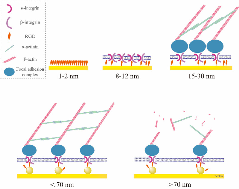 Figure 8 Schematic illustration showing the underlying RGD nanospacings to regulate cell adhesion.Upper row: Even if the RGD peptide is densely grafted onto gold surfaces, the steric hindrance of the RGD peptide size will result in a spacing of 1 - 2 nm between the nearest two RGDs. After one-to-one bioconjugating between an integrin and the ligand(s) at one small nanodot, some RGDs grafted on gold nanodots might be redundant for a static adhesion. So, the minimal effective nanospacing follows the integrin size of 8 - 12 nm. Integrins connect FA complex inside the membrane and interacts with cytoskeletal components to trigger focal adhesion. Combination of the dimension of a FA complex, the feature size along the material surface might be about 15 to 30 nm, which primarily interprets the minimal effective RGD nanospacing for an unpatterned gold surface with densely grafted RGDs, namely about 19 nm as shown in Figure 5. Lower row: When the RGD nanopacing is less than 70 nm, the cells can form a complete and powerful cytoskeleton junction, which is reflected in the macroscopic good adhesion of cells. When the RGD nanospacing is larger than 70 nm, due to the limitation of α-actinin length, stable cytoskeleton structure cannot be formed inside the cell, which is reflected in the significantly worse cell adhesion.