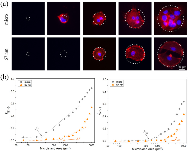 Figure 4 Critical adhesion areas of cells obtained by observation of cell numbers on microislands with increased sizes. (a) The relationship between cell numbers and the size of microislands together with nanospacings of micro-nanoislands. The F-actins were stained in red, and the nuclei were stained in blue. The number of nuclei indicate that of adherent cells on each micro/micro-nanoisland within the contour marked by the dashed circles. (b) The experimental approach to determine critical adhesion areas of cells on micro-nanopatterns with increasing microisland sizes. Left: fraction of cellular occupation per microisland (fN>0) on mere micropatterns (gray circles) and on 67 nm nanospaced micro-nanopatterns (orange triangles). Right: fraction of occupation of multiple cells per microisland (fN>1) on micropatterns and on 67 nm nanospaced micro-nanopatterns. The critical areas A* and Ac2 are from the crosspoints between the corresponding two marked asymptote lines of f N>0 and f N>1, respectively.