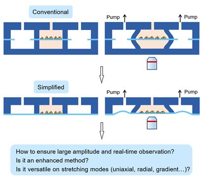 The possible bottleneck comes from varying the focus plane in z-direction during stretching driven by negative pressure, which must be significant under large stretching ratios. Ding’s group overcame such difficulty to a large extent, in the case of appropriate device parameters which were determined based upon finite element analysis and orthogonal experimental design. The novel chip was fabricated and confirmed to work in frequency up to 2 Hz and stretching ratio up to 20%.