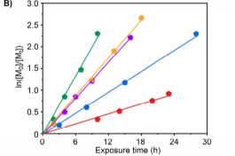 Figure 2. Alternating copolymerization of CTFE and vinyl ether (VEs) enabled by the photoredox catalysis. Points of different colors represent results obtained with different VEs: SiBVE (green), EVE (yellow), IBVE (purple), BVE (blue) and CEVE (red). A) Degrees of polymerization (DPs) of CTFE (filled circle) and VEs (empty circle) versus exposure time. B) ln([M]0/[M]t) versus exposure time. [M]0 and [M]t are the concentrations of VEs at time points 0 and t, respectively.