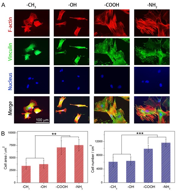 The above figure shows fluorescence micrographs of cells with F-actins, vinculins and nuclei stained after the MSCs underwent chondrogenic induction for 9 days on surfaces with indicated different functional groups, and statistics of spreading area and cell density on surfaces.