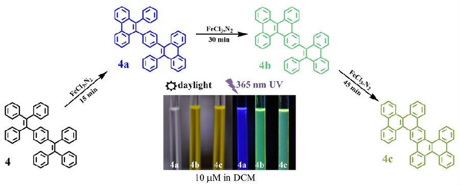 In this paper, graphene-like molecules were prepared by oxidative cyclodehydrogenation of tetraphenylethene oligomers using iron (III) chloride as the catalyst under mild conditions. All the oxidized samples can be separated effectively from the stepwise ring-closing reaction that highly related to the reaction time. Interestingly, we successfully obtained a series of colorful luminogens with blue, cyan and green-emission during this stepwise and accurate ring closing process, as shown in Figure 1.