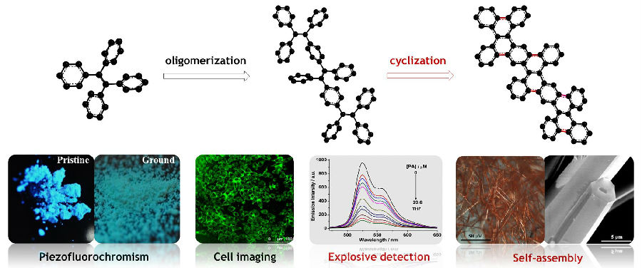 For the strong intermolecular interaction, our graphene molecules can self-assemble to form a red-colored and hexagonal fibre. Furthermore, some molecules exhibit piezochromic luminescence. The PL emission of the molecules before and after oxidation can be dramatically quenched by picric acid through the electron transfer and/or energy transfer mechanism, enabling them to function as chemosensors for explosive detection. In addition, fluorescence cell imaging studies proved their potential biological application.