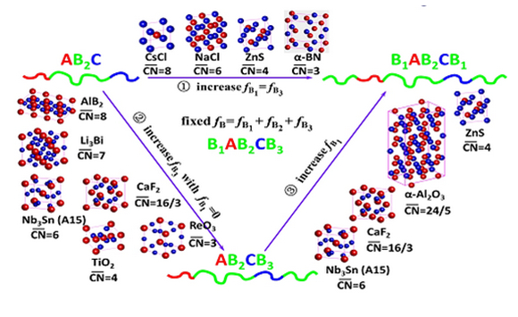 The understanding of self-assembly of complex multiblock copolymers is in the early stages though various multiblock copolymers have been synthesized accurately with the development of contemporary polymer chemistry. In this background, Weihua Li et al. drew a parallel between the complex spherical domains self-assembled from terpolymers and the crystal structure of ionic compounds and alloys. On this basis, they put forward and validated a design principle on chain structures of multiblock copolymers. A dozen binary mesocrystals including NaCl, CsC, ZnS, AlB2, CaF2 and Al2O3 were achieved based on this principle.